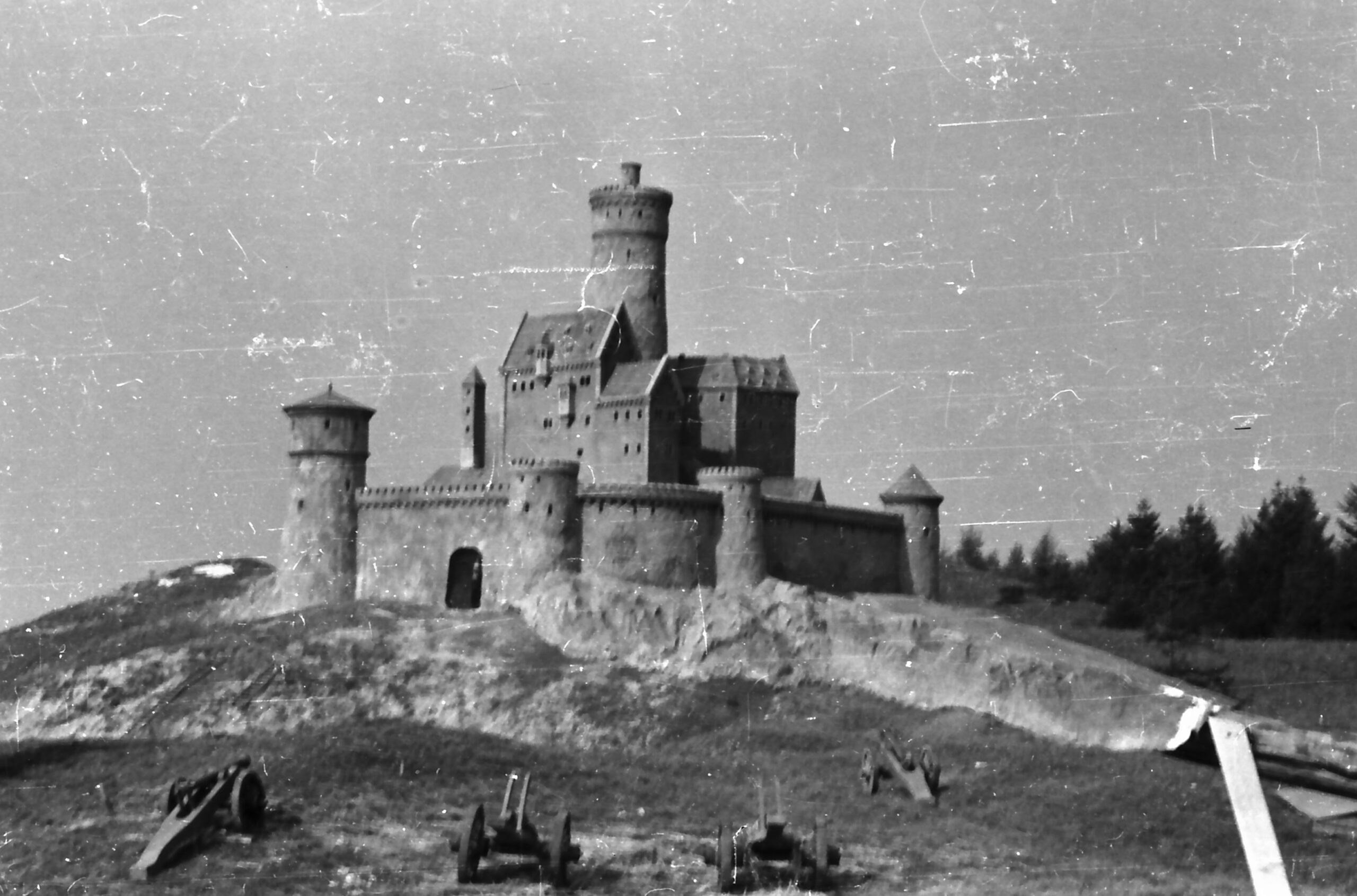 Trickkiste der analogen Filmkunst: Ein maßstabsgetreues Miniaturmodell verschmilzt nahtlos mit der realen Burgruine und dem Gelände im Hintergrund.